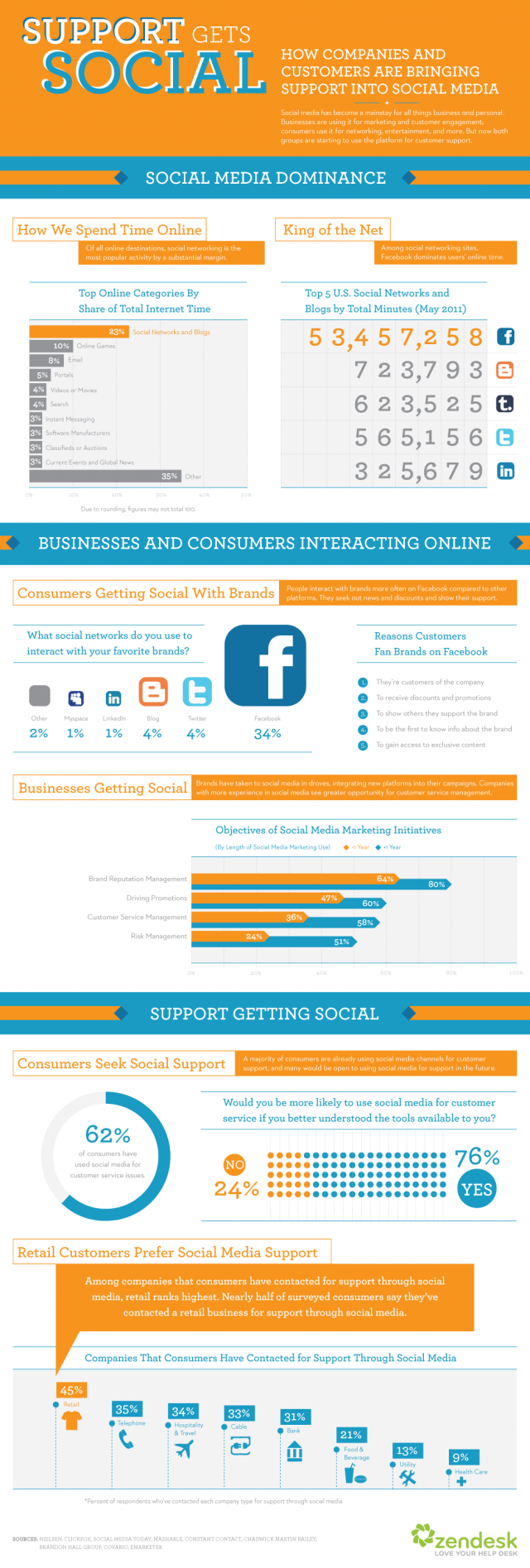 De acuerdo con una infografía creada por Zendesk, Facebook es la red social para personas que buscan interactuar con una marca específica. Personas pasaron 53.457.258 minutos en Facebook en mayo pasado. Eso es más de 890.000 horas puras en redes sociales. El principal objetivo de Facebook es que la gente comparta sus interacciones y el contenido en la Web. Por lo tanto, proporciona herramientas para ayudar a las personas que los promotores de la marca, sin siquiera saberlo. Por ejemplo, la compañía ha lanzado recientemente “acciones”, que permite a los usuarios de Facebook para hacer más que sólo “me gusta” algo, sino que “quiere”, “compró”, o “comió” ese tema. Esto crea una forma de participación más fácil decir: “¡Me guta mas la última temporada de The Big Bang Theory en DVD de lo que le gusta la prueba de la teoría de cuerdas!”
