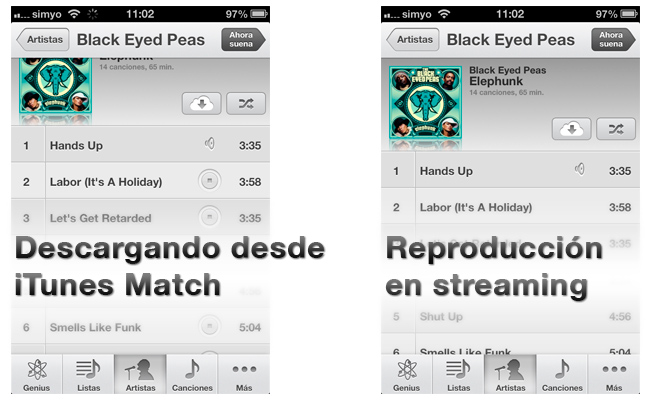 Pues bien, con iOS 6 esto cambia y por fin podemos reproducir la música que tengamos en iTunes Match en nuestro iPhone, iPod Touch o iPad sin necesidad de ser descargada. Cuando accedemos a la aplicación música y seleccionamos un álbum o canción que no tengamos guardada en nuestro dispositivo podremos realizar dos acciones: reproducir la canción vía streaming o descargarla como antes.