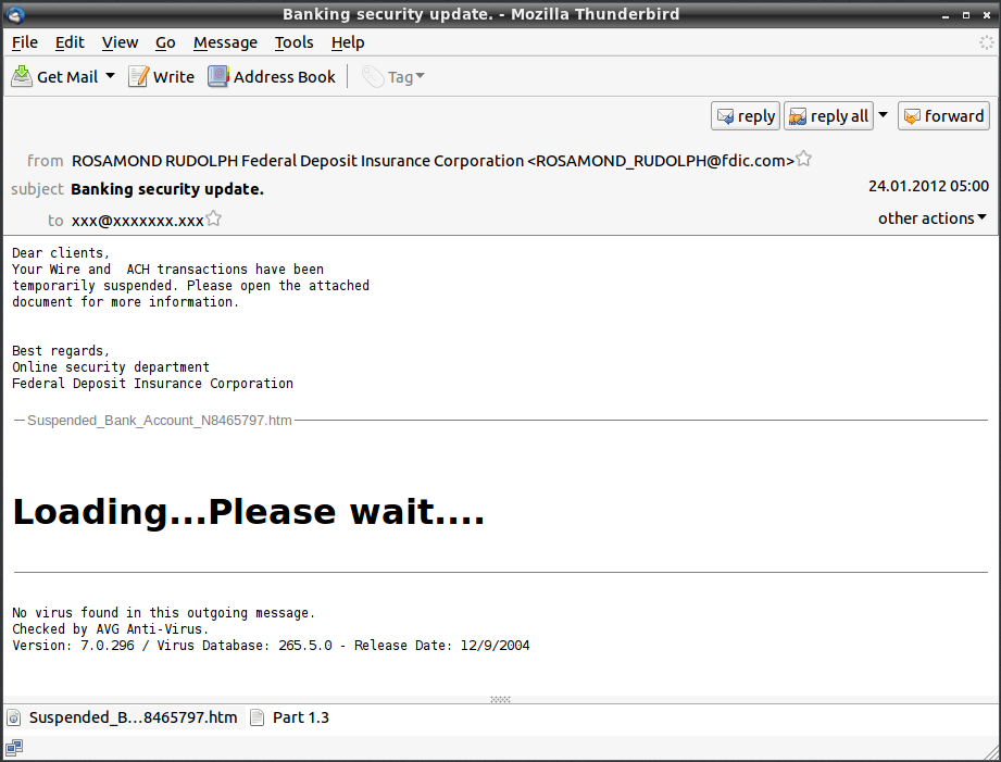 La empresa ha proporcionado una captura de pantalla de lo que la actual oleada de virus portadores de mensajes de spam parece, con el titulo de “Banca de la actualización de seguridad” y una dirección de remitente con el fdic.com de dominio, una compañía de seguros con sede en EEUU.