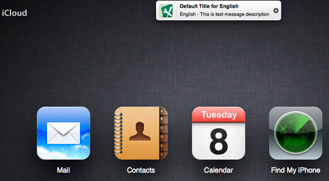 Apple ha cometido un infrecuente desliz al escapársele una pista sobre la llegada de su sistema de notificaciones al sitio web de iCloud. Como podéis ver en la captura, algunos usuarios ingleses se encontraron con un banner de prueba con el título “Default Title for English” seguido del texto “English – This is test message description.” que claramente no se suponía debía ser visto.