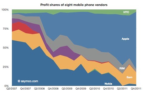 La noticia se pone cada vez mejor para Apple en el negocio de telefonía móvil. Ayer mismo, IDC informó que la compañía ocupa el tercer lugar en términos de ventas mundiales de teléfonos móviles. Hoy en día, analista de Asymco de Horace Dediu anunció que con una pieza relativamente pequeña de la torta (IDC dijo que el 6 por ciento del mercado, Dediu dice un 8,7 por ciento), Apple está en el 75 por ciento de las ganancias en la industria.