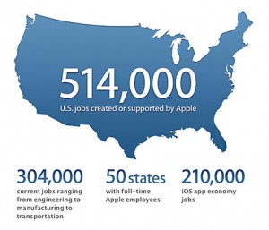 Hable acerca de la economía de las aplicaciones. Apple tiene una página web que los datos de la economía de Apple y el número de puestos de trabajo de la empresa ha creado en los EE.UU.. El número oscila en un asombroso 514.000 con 47.000 puestos de trabajo en la propia Apple y 257.000 puestos de trabajo en otras empresas relacionadas en campos como las ventas de componentes, servicios técnicos, e incluso los blogs como TUAW. Hay otros 210.000 empleos relacionados con la aplicación que se derivan de la tienda iOS aplicación. Usted puede ver el desglose completo en el sitio web de Apple .