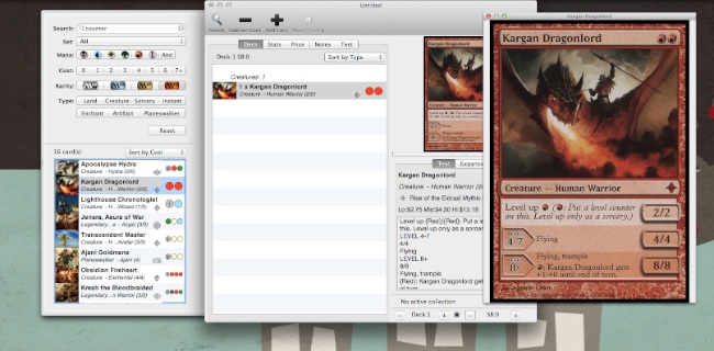 Decked Builder es una aplicación disponible para iOS y OS X (también para Android) que nos permite construir nuestro mazo de forma rápida. Podremos acceder a una base de datos completas y filtrar las cartas según nuestras preferencias como el coste en maná, color, tipo de carta (Instant, Interrupt, Artifact,…) o si es común, infrecuente o rara.