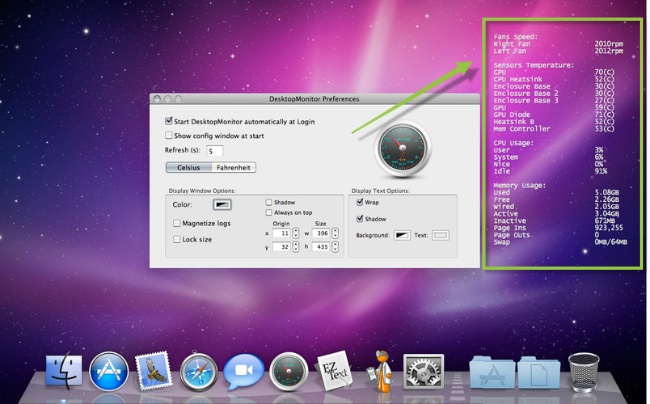 Desktop Monitor es muy parecido a lo que podemos conseguir con Geektools, sólo que más sencillo y sin necesidad de andar introduciendo comandos. Eso sí, también es menos personalizable. La aplicación apenas tiene preferencias salvo un par de aspectos como la sombra en los textos y poco más. Una vez iniciada veremos toda la información en nuestro escritorio, tal y como veis en la imagen (dentro del recuadro verde). El precio de Desktop Monitor es de 1,59€ y la podéis descargar desde la Mac App Store.
