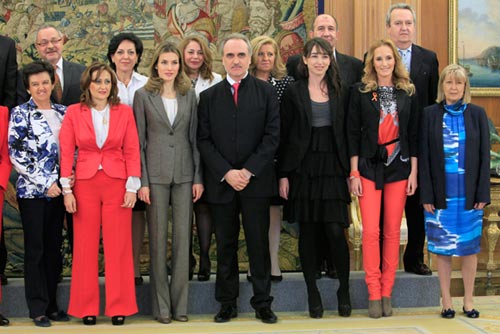 La segunda visita de la princesa Letizia era una representación del Consejo Asesor de Madrid Woman’s Week, un foro de pensamiento abierto sobre la mujer actual, cuya presidencia de honor aceptaron los príncipes de Asturias en enero de 2011. La princesa daba la bienvenida a palacio a una iniciativa que pretende cambiar la situación, en clave de igualdad y diversidad, sin renunciar a ser observatorio de alertas para evitar pasos atrás. Saludaba uno a uno a todos sus invitados, porque el cambio de mentalidades no puede hacerse si no es trabajando juntos hombres y mujeres, en un feminismo nuevo del siglo XXI que no es excluyente, y entre ellos con especial cariño a dos mujeres muy conocidas, María Teresa Ortiz Bau y Sandra Ibarra. No se marcharon sus invitados sin comentar los diversos actos que se celebran anualmente entorno a la Semana Internacional de la Mujer: un espacio de Pensamiento (congresos y conferencias), un espacio para la Cultura (danza, artes plásticas, debate) y un Salón Mujer Actual; además de los premios solidarios Artistas con Corazón y los Premios Internacionales EVA.