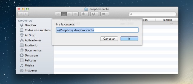 El proceso es sencillo, el archivo dropbox.cache está oculto por lo que tenemos que acceder a él. Para ello podemos recurrir a un comando de terminal que nos muestre todos los archivos ocultos o directamente escribir la ruta a la que queremos ir. La opción más sencilla es esta última. Desde Finder vamos a Ir -> Ir a la carpeta (atajo de teclado Shift + Comando + G). Ahora escribimos ~/Dropbox/.dropbox.cache. La carpeta que nos aparece es la que podremos borrar si vemos que ocupa demasiado. Normalmente esta caché de Dropbox está formada por archivos que hemos o han compartido compartido otros usuarios temporalmente.
