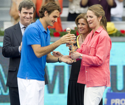 La infanta Elena, a quien este fin de semana veíamos junto a la Reina haciendo llegar personalmente su pésame a la familia Urdangarín en Vitoria y quien hoy felicitará a sus padres por su 50 aniversario de boda, fue la encargada de entregar a Federer el trofeo acompañada por Ana Botella y extenista Manolo Santana, con los que compartió palco durante todo el partido.
