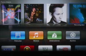 La antigua interfaz, aunque se conserva en gran parte a lo largo de los diferentes submenús que tiene el dispositivo, ha cambiado totalmente en su presentación general. Ahora los diferentes apartados a los que podemos acceder se encuentran ordenados por orden de relevancia en forma de iconos que recuerdan inevitablemente a la pantalla de cualquier dispositivo iOS. En una primera fila encontramos “Películas”, “Música”, “Ordenadores” y “Ajustes”. Mientras que en la primera se basará en la iTunes Store, que cada vez cuenta con mayor oferta en castellano, con “Música” podremos conectar nuestro Apple TV a iTunes Match a través de iCloud. Tanto “Ordenadores” como “Ajustes” seguirán desempeñando la misma función, conectar con nuestra biblioteca de iTunes y configurar el dispositivo.