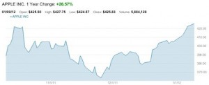 El viernes, 6 de enero las acciones pasivas de Apple marcaron un hito al cerrar a un precio récord máximo de 422,40 dólares EE.UU. por acción. Eso hace que la capitalización de la compañía en el mercado quede tentadoramente cerca de $ 400 mil millones de dolares.