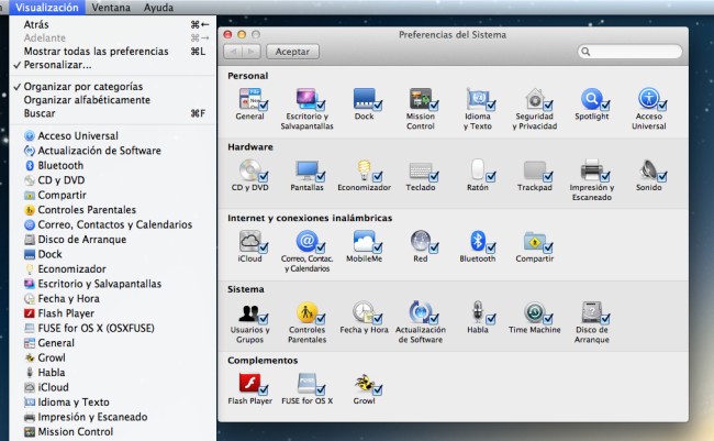 Para hacerlo tendremos que acceder al Panel de preferencias y en el menú Visualización hacer clic en Personalizar. Nos aparecerán unas casillas para marcar o desmarcar si queremos que sea visible o no. A priori esto no tiene ninguna utilidad mayor que ocultar algunas preferencias que no uséis frecuentemente (aunque tampoco molesta el dejarlas) o lo que creo sería más útil, configurarlo para evitar que la cuenta de un usuario menos experto puede tocar lo que no debe (dentro de los privilegios que tenga).