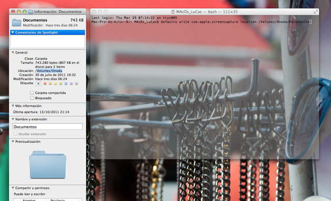 Pero es posible cambiar esto desde el propio sistema, y para ello deberemos valernos del terminal incluido en el mismo. Mediante unos sencillos comandos podremos variar la configuración por defecto que trae definida OS X. Para cambiar la carpeta donde el sistema guarda nuestras capturas deberemos escribir lo siguiente en el terminal “defaults write com.apple.screencapture location ++ruta de carpeta++”. En “ruta de carpeta” deberemos escribir la ruta exacta de la carpeta donde queremos que guarde nuestras capturas de pantalla. Si no estás seguro de la ruta exacta de la carpeta donde quieres guardar las capturas, recuerda que puedes verla seleccionando la carpeta en el Finder y con el botón derecho “Obtener información”. En la “Ubicación” veras la misma.