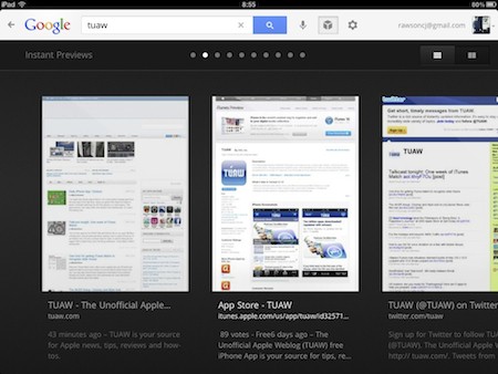 Resultados de la búsqueda aparecen en una presentación de diapositivas en el panel del lado derecho de la pantalla, en el paisaje de ver este panel puede ser parcialmente clavado en el lado derecho, que le da una vista previa de las páginas que se cargan cuando se pulsa sobre los resultados de búsqueda en la ventana principal . Usando una interfaz similar a la Vista previa instantánea, historial de búsqueda ahora se muestra como una representación visual de su historial de búsquedas, muy similar a las obras de vista la manera en la historia de Safari en el Mac.