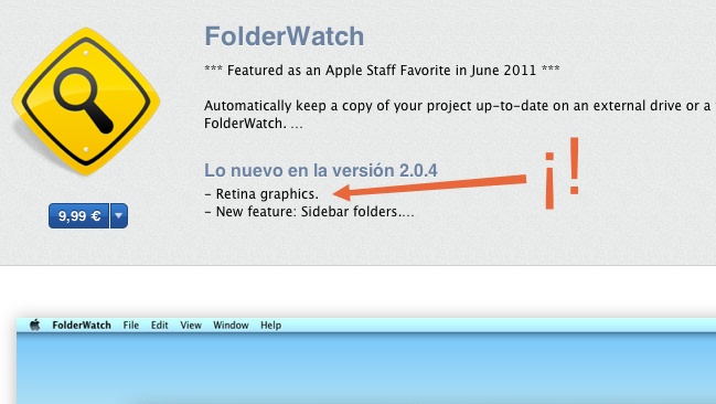 FolderWatch es un ejemplo: en su última actualización a la versión 2.0.4 podemos ver cómo una de las novedades son esos gráficos retina. Y no parece un error, porque la característica se ha promocionado desde la cuenta de sus desarrolladores @brothersroloff en Twitter. Todo indica que la aplicación está preparada para una actualización de OS X que traerá soporte para pantallas retina en un futuro.