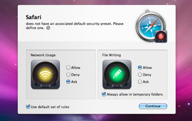 Cuando una aplicación accede a internet Hands Off! muestra una ventana en la que podemos dar permiso o no, incluso si queremos que el acceso sea permitido sólo una vez, hasta que cerremos la aplicación o para siempre.