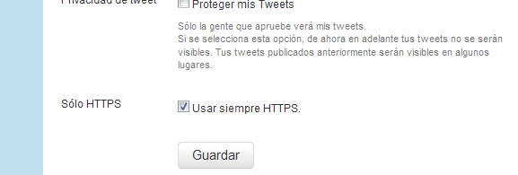 Entrar en twitter.com será más seguro si utilizamos la opción de forzar el acceso a través de https o servidor seguro. Se hace desde las opciones, Configuración > cuenta y la opción que véis más abajo.