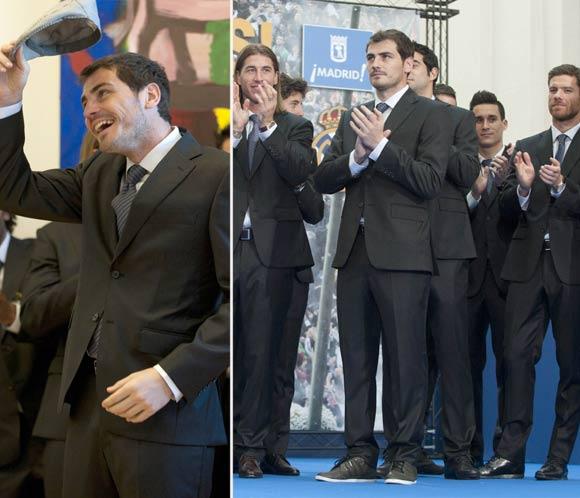 Desde que conocieran en Bilbao que eran los ganadores de la Liga BBVA los jugadores del Real Madrid no han parado de celebrarlo por todo lo alto. En el campo al término del partido, con los aficionados y ahora con diversas personalidades de la Comunidad de Madrid, que han querido felicitarles por su nuevo título. Así, la jornada de hoy ha estado cargada de reconocimientos y halagos para los astros del club blanco, que temprano fueron recibidos en la Casa de los Correos de Madrid por Esperanza Aguirre, Presidenta de la Comunidad. Durante la recepción, Aguirre les ha hecho entrega de una placa conmemorativa. Tras ello, todos los jugadores se dirigieron al balcón de la fachada de la Puerta del Sol para saludar a todos los aficionados que se acercaron hasta allí para celebrar el triunfo blanco. Acto seguido, la celebración continuó en el Palacio de Cibeles, donde esta vez la Alcaldesa Ana Botella estuvo con Iker Casillas, Sergio Ramos, Xabi Alonso y el resto de la plantilla. El momento más anecdótico de la mañana lo protagonizó el capitán, Iker, cuando Botella le colocó sobre la cabeza la característica boina de chulapo madrileña.