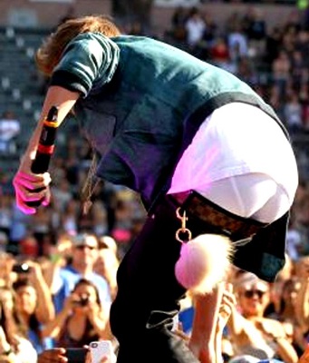 Justin se encontraba actuando en el concierto Rock Wango Tango 2012, en Los Ángeles, un evento organizado por Kiss-FM, el cantante se movía por el escenario saludando a sus fans cuando al querer agacharse para estrechar la mano de sus admiradoras los pantalones cedieron y quedó al descubierto su trasero.