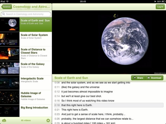 Si por algo me gusta el iPad es por sus inmensas posibilidades para la enseñanza. Libros, aplicaciones multimedia interactivas, vídeos, audio, podcasts, tests, anotar en archivos PDF…. si utilizamos todas ellas para aprender facilitará muchísimo nuestro camino. Así, podremos aprender sobre matemáticas, biología, química inorgánica y orgánica, salud y medicina, física, astronomía, informática, finanzas, ….. Por si fuera poco, muchos de los vídeos están subtitulados por si tenemos algún problema con el inglés o también por si queremos repasar. La verdad es que la calidad de las explicaciones, la calidad del vídeo y el buen hacer del profesor hacen una auténtica delicia aprender cualquier cosa. Lo que sea.