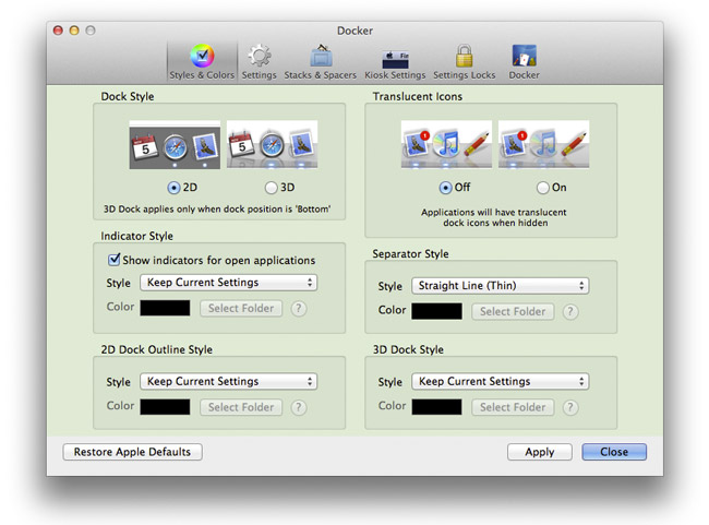 Docker nos ofrece la posibilidad de realizar cambios que afectan al aspecto visual del dock. Por ejemplo podremos cambiar si queremos un Dock en 3D o 2D, si usamos la vista 3D podremos cambiar la imagen del mismo, si queremos reflejo o no, iconos translucidos para aplicaciones escondidas, el separador, la animación…