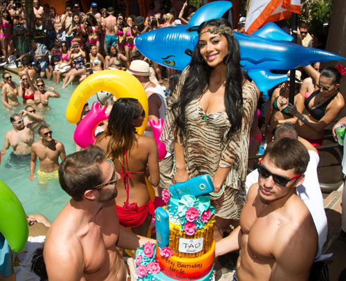 Las celebraciones empezaron por la por mañana, en la piscina del hotel The Venetian de la ciudad del juego. Allí lució un bikini con una camisola a juego con estampado de leopardo y una diadema con brillantes adornando su pelo, y animó a todos los que se acercaron para disfrutar de la fiesta. Las actuaciones de la cantante de las Pussycat Dolls suben la temperatura, pero en esta ocasión todos los que estaban en este hotel, pudieron disfrutar de sus canciones bailando dentro del agua.