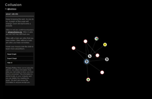 Mediante círculos de colores que aparecen por cada rastreo, los usuarios pueden ver lo que ocurre al visitar una nueva web, lo que conlleva a “traspasar” la información a terceros sin que los propios usuarios sean conscientes de ello. Cada vez que la extensión Collusion detecta que los datos se envían a otro espacio, el plug-in crea un nuevo punto que se dividen en colores: rojo (anunciantes), gris (web) o azul. Después, Collusion muestra los vínculos entre las webs que se visitan y el seguimiento que se produce.
