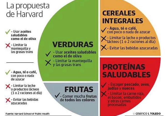 En el campo de las proteínas, los expertos de la universidad ponen el acento en el pescado, el pollo, las legumbres y los frutos secos por su rico contenido en nutrientes. Animan a limitar la carne roja y evitar por completo la carne procesada -ayer mismo, una investigación sueca conectaba el consumo de salchichas y beicon con el cáncer de páncreas-. El catálogo de dolencias asociadas a la ingesta de estos productos de manera regular incide en todo tipo de tumores y dispara los kilogramos. Un grave error en la guía gubernamental, según Harvard, es situar a las hamburguesas o los perritos calientes como proteínas tolerables que se pueden comer de vez en cuando, además de no mencionar el hecho de que algunos alimentos ricos en proteínas son más saludables que otros.