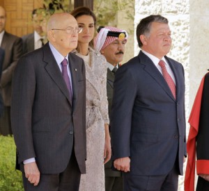 La reina Rania, poco asidua últimamente a las citas sociales, a excepción de las solidarias, volvió a desplegar elegancia en la Corte Real jordana, esta vez como perfecta anfitriona. La soberana y la primera dama acompañaron al rey y al mandatario italiano en el pase de revista a las tropas ante el palacio real de Amman durante la solemne ceremonia de bienvenida y en la posterior entrevista que ambos dirigentes mantuvieron. Una reunión para mejorar sus relaciones diplomáticas en la que analizaron las reformas emprendidas en ambos países, el conflicto en Siria y el proceso de paz de Oriente Medio.