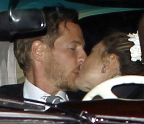 Sin poder llegar a su siguiente destino, los recién casados nos regalaron una de las fotografías más bonitas del enlace, uno de sus primeros besos como marido y mujer. Acomodados en el interior de un coche, un clásico Mercedes, en el que podía leerse el popular cartel de “Just Married” adornado con una cintas de colores y acompañados tan solo por un chofer, la pareja dio rienda suelta a su amor dejando así patente que este era uno de los días más felices de su vida.