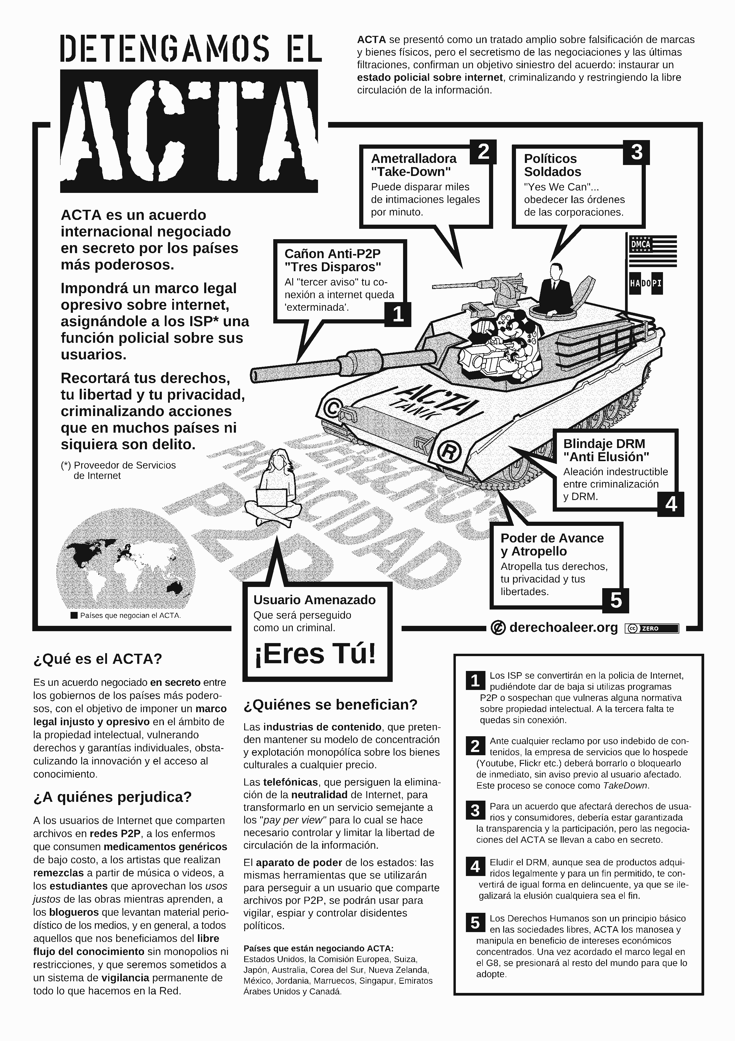 El acuerdo comercial contra la falsificación es, a pesar de su nombre, efectivamente un tratado internacional que obliga a los signatarios a tipificar como delito “a escala comercial” derechos de autor y marca registrada como infracción. Parte de ella cubre knock-off de mercancías, pero la mayoría se aplica al mundo digital. Muchas de las disposiciones del ACTA que ya existen en países como Estados Unidos y el Reino Unido,por ejemplo, que hace que los tribunales puedan bloquear o acabar con sitios web que infrinjan las normas y la idea es aparentemente para todo el resto del mundo en línea.