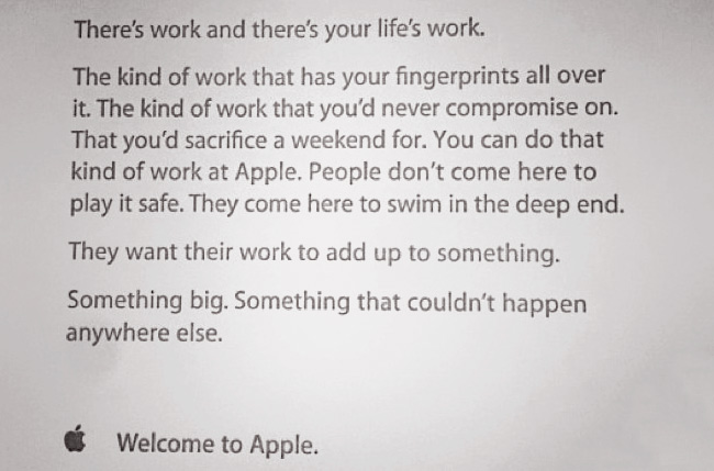 “En Apple ponemos nuestra dedicación en crear productos increíbles que inspira y deleita a la gente. Nos enorgullecemos de hacer a nuestros clientes los más satisfechos del mundo. Es una meta muy alta, y para alcanzarla se necesita de todos en Apple, junto con socios como tú.