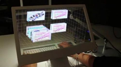 El primero es un. Ver a través de la pantalla interactiva de escritorio en 3D, que no parece tener un nombre todavía, pero es verdaderamente una de las mejores pantallas que venga en un buen tiempo La razón de su transparencia se debe a que las manos de los usuarios y el teclado ir detrás de la pantalla de modo que ambos pueden ser utilizados para manipular las imágenes en 3D que parecen flotar en el espacio entre los objetos reales y los que se muestran en la pantalla OLED. Para mover un cubo por ejemplo, un usuario simplemente se remonta y coge o lo empuja (movimientos de las manos y la cabeza se realiza un seguimiento por un dispositivo de Kinect). Pero eso no es todo, la pantalla es en 3D desde cualquier ángulo que se miraba, dentro de lo razonable, por supuesto. Esto significa que si un usuario se mueve a un lado, más de la tridimensionalidad del objeto visualizado en la pantalla se puede ver, tal como ocurriría eran una persona que se busca en un verdadero objeto tridimensional.