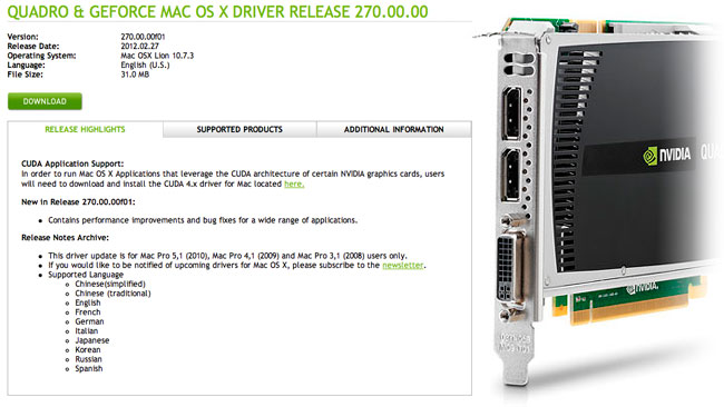Pero parece que esto puede llegar a su fin. Nvidia ha lanzado una nueva versión de sus controladores para los usuarios de un Mac Pro (modelos 3.1, 4.1 y 5.1). Y según han podido comprobar algunos usuarios, los nuevos controladores permiten usar todas las tarjetas gráficas comprendidas entre los modelos 9400GT y GTX580, ambas incluidas.