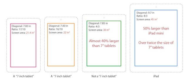 ¿Es que Apple ha cambiado de idea en los últimos años? Tal vez lo que se refería Apple es que los tablets de 7 pulgadas de la competencia no tienen sentido. Y para aclarar este detalle, nada mejor que ver la imagen que acompaña esta entrada.