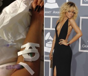 Después de la gala benéfica 2012 del Costume Institute en el Metropolitan Museum de Nueva York, Rihanna tuvo que ser ingresada en un centro hospitalario. La cantante comenzó a sentirse mal y requirió la atención de los servicios médicos según avanzaba la noche. Al final, fue derivada al hospital y allí le diagnosticaron cansancio extremo y deshidratación. Después de ponerle suero durante unas horas, Rihanna recibió el alta médica y no dudó en publicar en las redes sociales esta fotografía a modo de prueba.