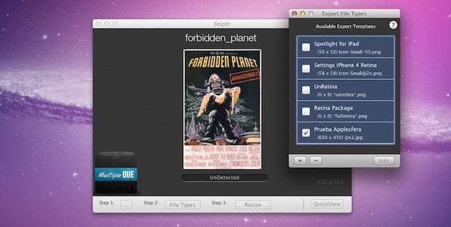 Esta aplicación nació originalmente de la necesidad de su creador de redimensionar las imágenes de sus aplicaciones para iOS al tamaño de la Retina Display, o viceversa. Antes era un tedioso trabajo manual y pensó que necesitaba un programa simple y rápido que lo hiciera por él, así que desarrolló este ShipIt!. La aplicación no sólo permite redimensionar a un tamaño, sino que podemos elegir entre varias configuraciones de salida para que nuestras imágenes se conviertan a las seleccionadas, y añadir nuevas.