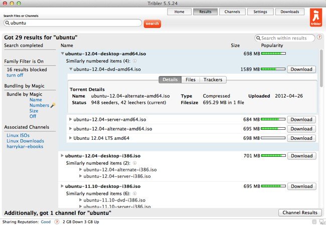 En la pestaña de resultados, tenemos información bastante detallada de las posibles descargas, con un indicador de popularidad, tamaño del archivo, número de seeders y leechers actuales, etc. Asimismo en dicho panel podemos ver los canales asociados a dicha búsqueda, quitar o poner el filtro familiar, y criterios de ordenación. Si nos fijamos en la parte inferior de dicha ventana, tenemos nuestra reputación en la herramienta, indicando el volumen de datos descargados y los que hemos subido. Esto tiene más importancia de lo que parece, ya que cuantos más datos subamos mejor será nuestra reputación y más rápidas serán nuestras descargas.
