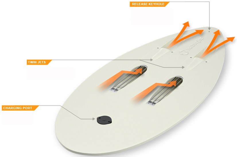 El invento es, sobre el papel, sencillo: un mecanismo de aluminio, colocado en la parte inferior de la tabla, que expulsa dos potentes chorros de agua gracias a una batería de litio cuya autonomía (utilizándola continuamente) es de entre 30 y 45 minutos.